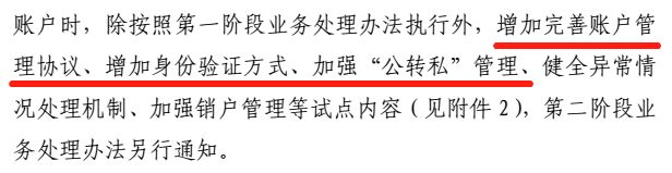 开户证取消后,试点地区银行将为企业开立基本存款,将增加账户管理协议,增加身份验证方式,加强“公转私”管理、健全异常情况处理机制、加强销户管理等试点内容,第二阶段业务处理办法另行通知。